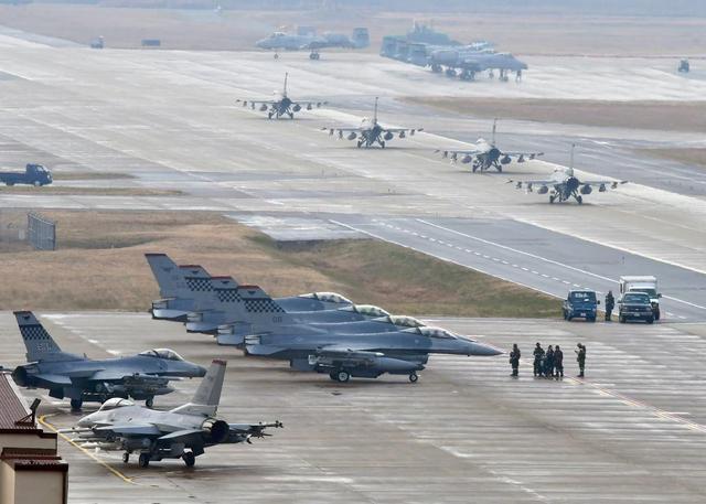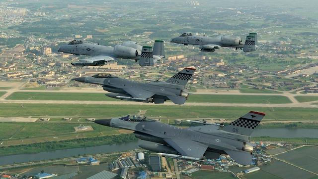 举例来说,驻韩美军中最有可能被投入台海方向作战的,就是驻扎在乌山、群山两地的美国空军第七航空队,该航空队下属的F-16等战斗机在加挂副油箱或者进行空中加油的情况下,可以参与到台湾岛以北空域的作战。